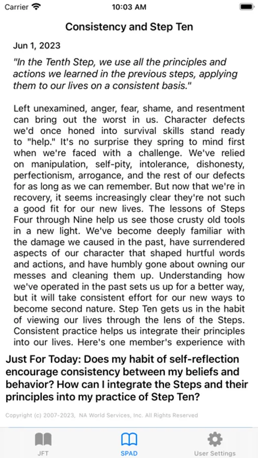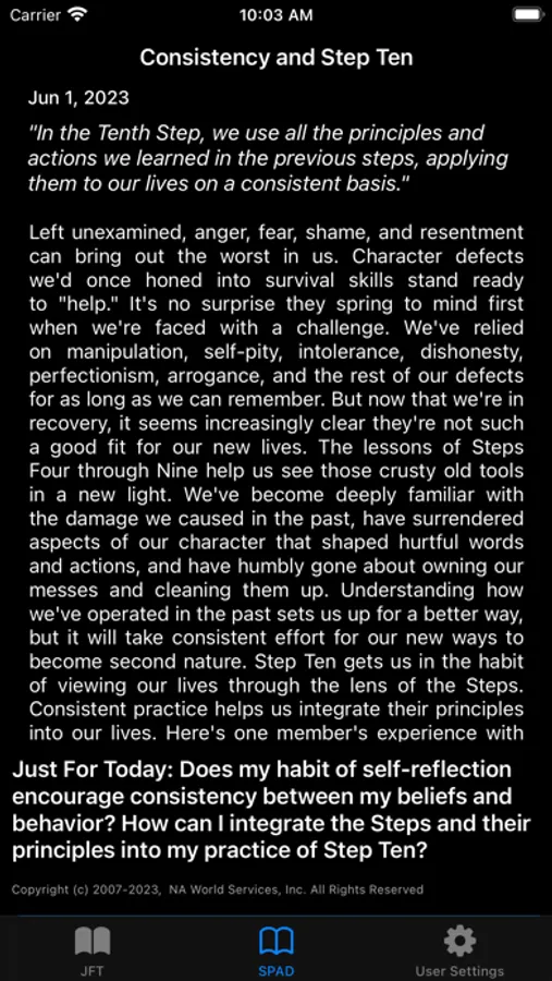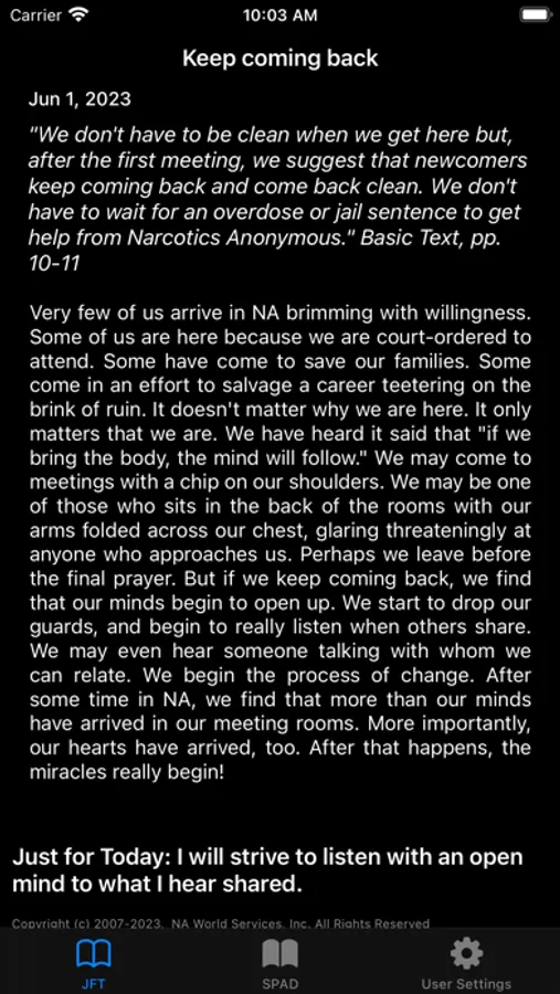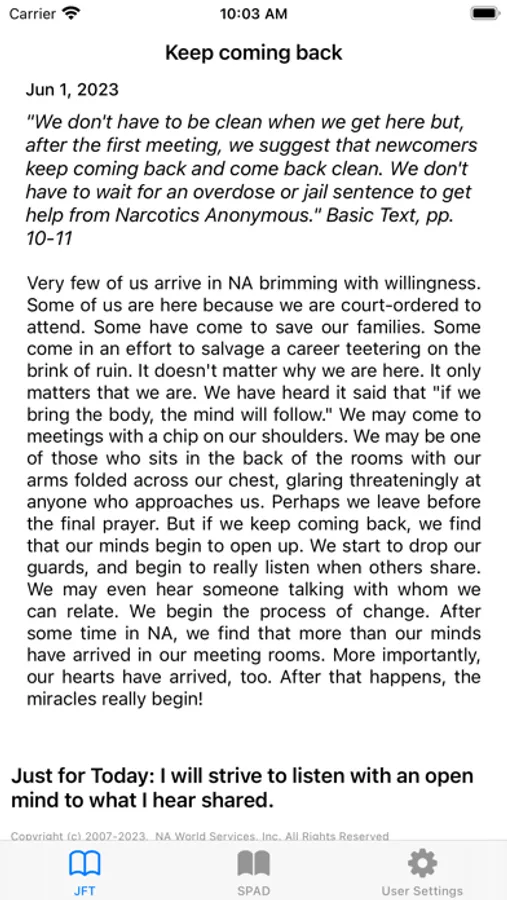 ConnectionJFT allows user to comment on the meditation for the day and share their experience, strength and hope.