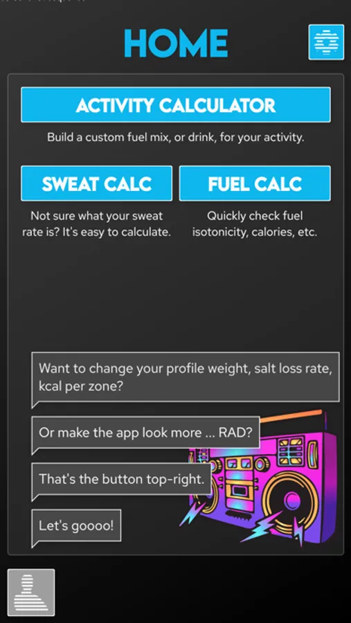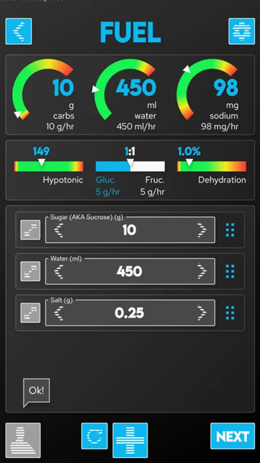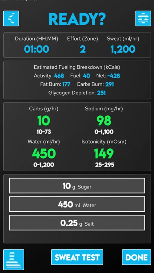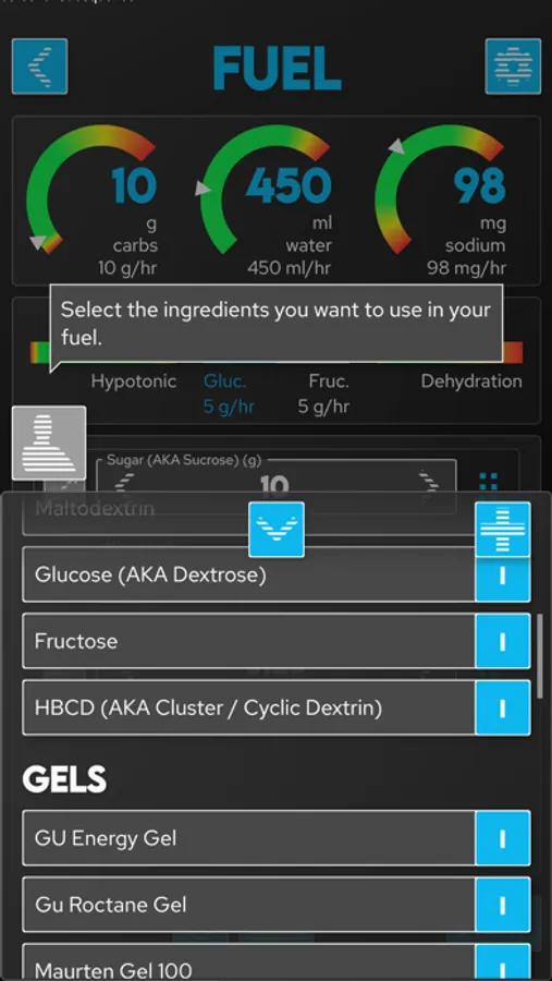 Once you've calculated nutritional needs the app will guide you through building fuel to meet those requirements using commercial gels and powders ... or from salt, sugar, water from your kitchen!