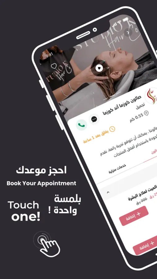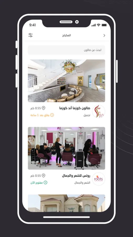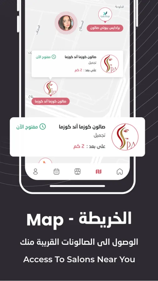 تستطيع حجز مواعيد لدى الصالونات القريبه منك بواسطة الخريطة المدمجة واختيار الخدمات المقدمه من قبل الصالون.