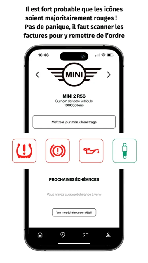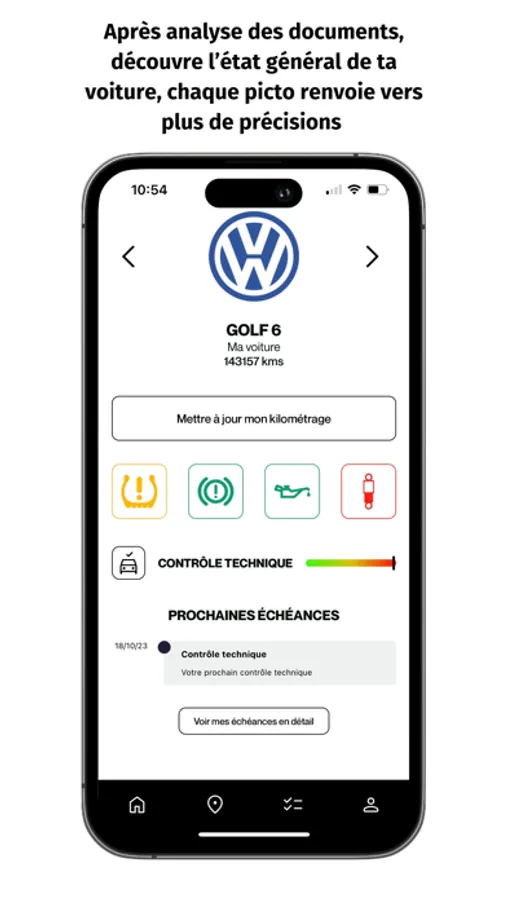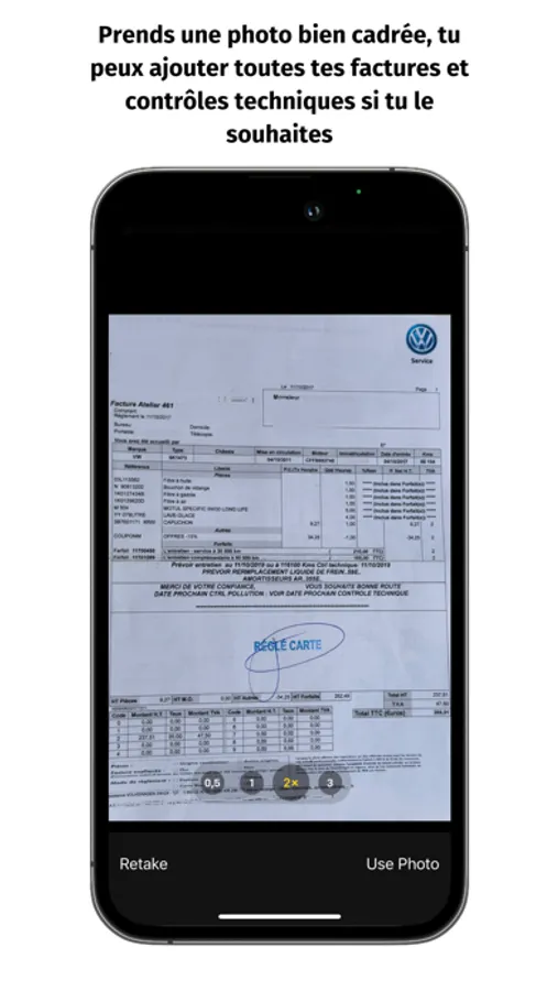 Grâce à notre fonctionnalité de carnet d'entretien numérique, vous pouvez facilement suivre les opérations d'entretien de votre voiture. Prenez simplement vos factures en photos et notre IA se charge de les trier, de les classer et de les lire.