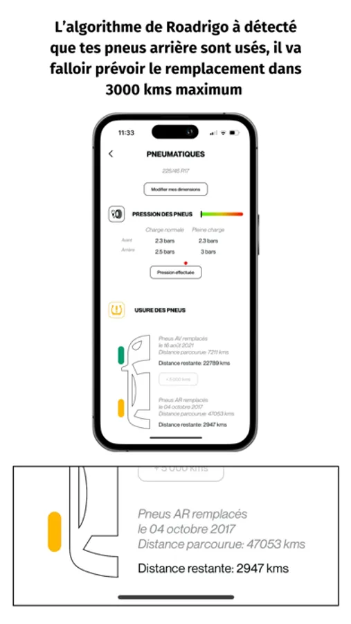 L'application ROADRIGO utilise les informations de vos factures pour vous prévenir des dates d'échéance de l'entretien, du contrôle des pneus ou du contrôle technique. Elle vous aide également à prévoir les frais à venir, vous permettant de planifier et de budgétiser à l'avance.
