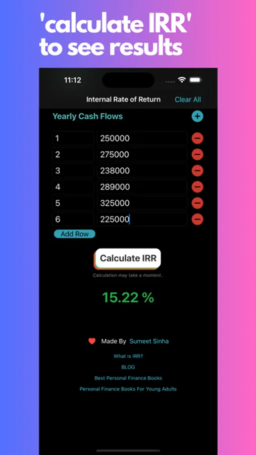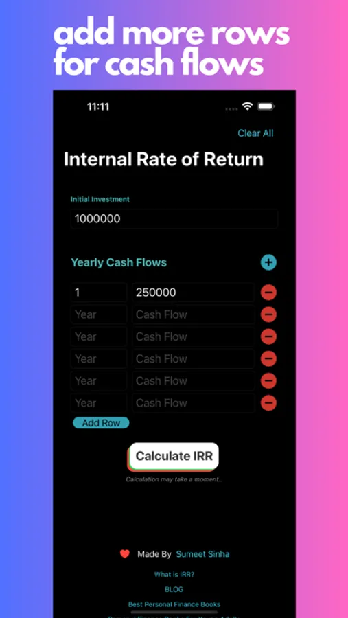 Flexible Cash Flow Inputs: Gain a comprehensive understanding of your investment's profitability with a customizable cash flows projection. IRR Calculator presents opportunity to input a year and projected inflows and outflows for that year. There's no hardcoded years, and you can add and delete as many rows as possible - so you get the best experience.