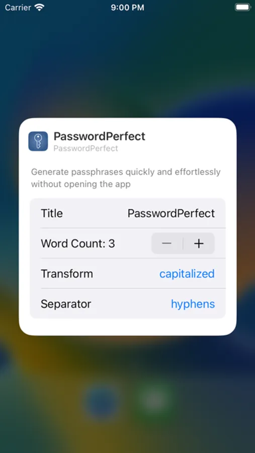 * Time-Saving Widget: Access PasswordPerfect from your iOS device's home or lock screen. Generate passphrases quickly and effortlessly without opening the app.