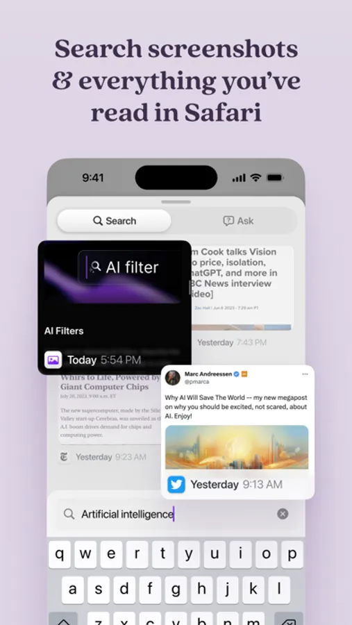 • Instant search: Everything you’ve read in Safari and all your screenshots are processed using Optical Character Recognition (OCR) and made instantly searchable.