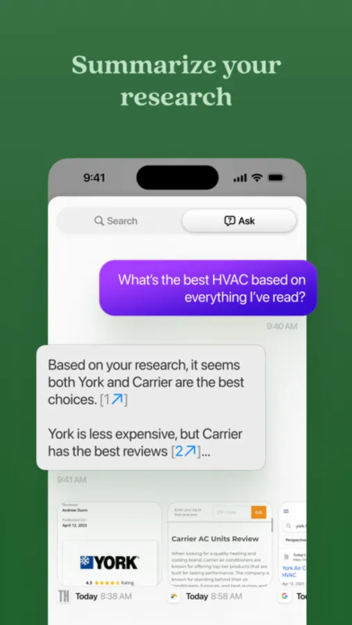 • Summarizations: Condense all the research you’ve done into digestible summaries with AI.