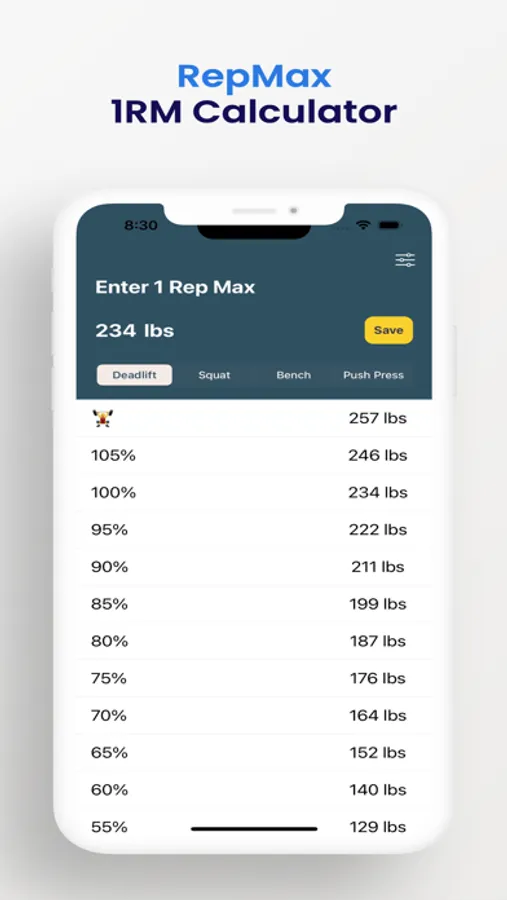 SIMPLE, INTUITIVE INTERFACE: No need to be a tech whiz to use RepMax. Its intuitive design and simple-to-use interface make calculating and tracking your lifts a breeze. Just input your max lift, and let the app do the rest!