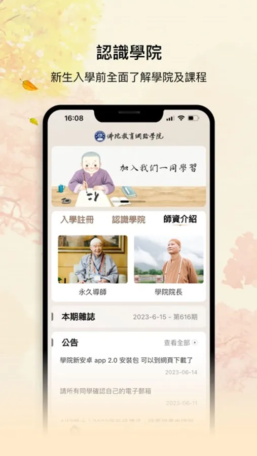1、學院:結合學院行政管理,為新舊同學提供師資介紹、認識學院、入學註冊、本期雜誌、學院公告、延伸學習等功能;