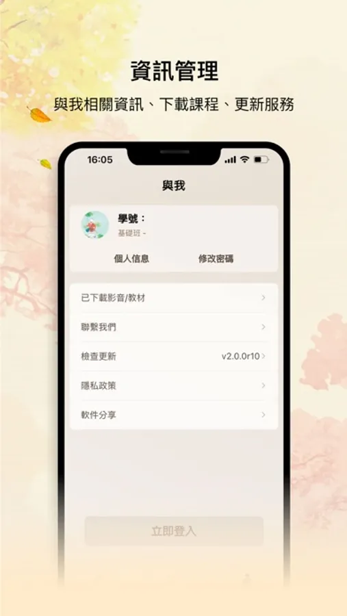 3、與我:與我相關的內容集中於此,包括個人信息、修改密碼、查看已下載影音/教材等功能。