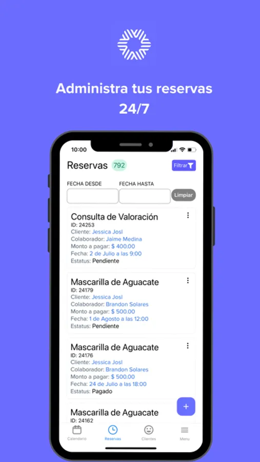 - Ahorra tiempo en la gestión de citas: invita a tus clientes a reservar por nuestra app para clientes, sitio web o tu micro sitio de reservas y reserven totalmente en línea y de manera autónoma ¡sin necesidad de llamarte o enviarte un mensaje! ¿Imagina lo cómodo que será para ti y para ellos?