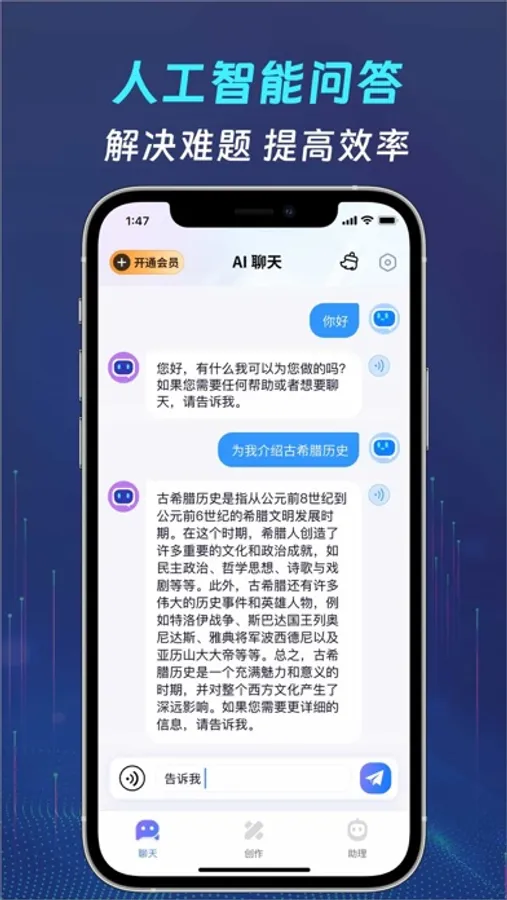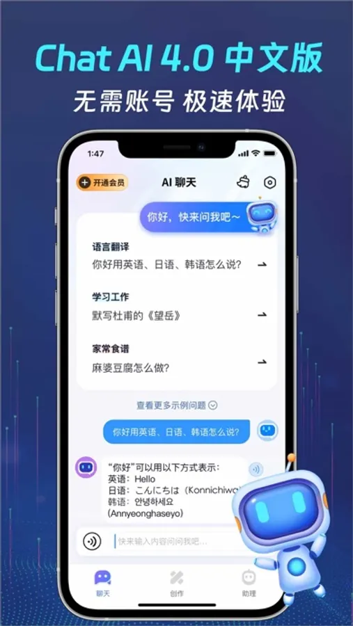 1.智能聊天:提供通用的聊天场景,拟人化的聊天语气,支持任何语言的沟通交流,解答您的任何问题,为您提供更有效的解决方案