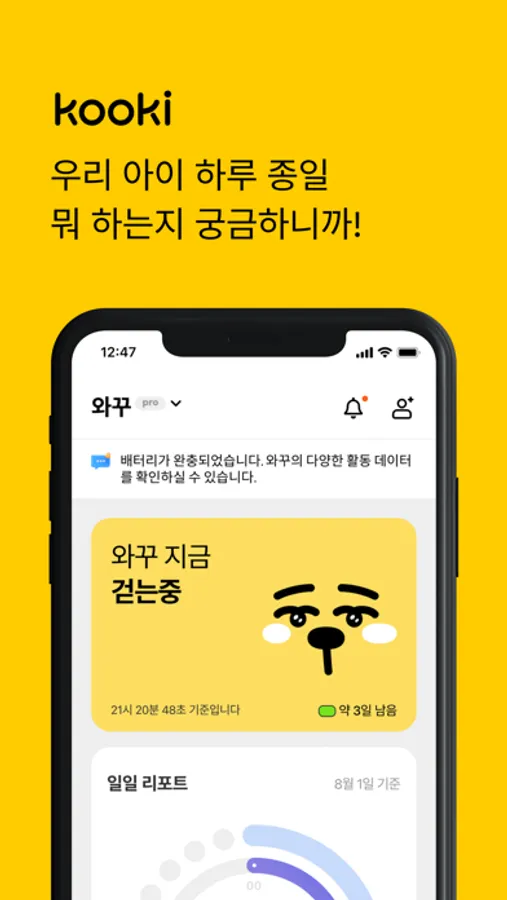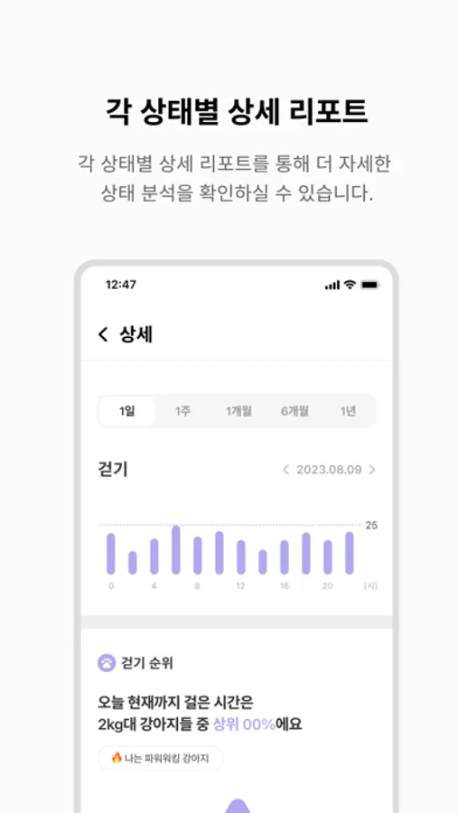 종합 리포트 : 평소에 비해 식욕이 없는지, 배변 횟수가 지나치게 증가했는지, 또래에 비해 활동량이 낮은지 등 종합 분석을 제공합니다.