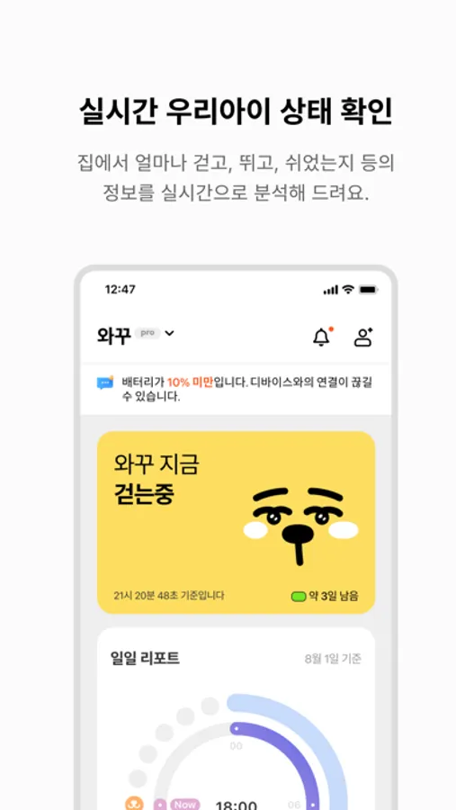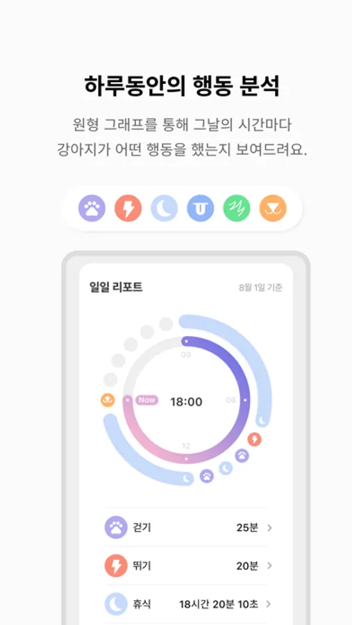 24시간 행동 기록 : 한눈에 보이는 시간표에 오늘 하루의 행동 - 걷기, 뛰기, 쉬기, 배변과 배뇨 등이 기록됩니다.