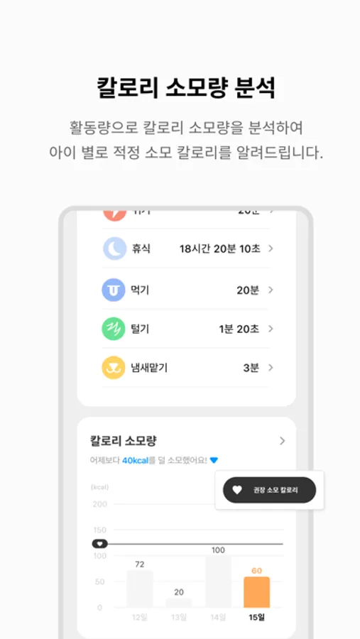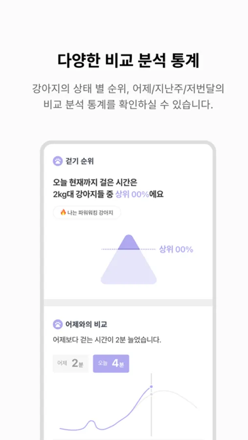활동량 분석 : 우리 강아지의 나이와 체중에 맞는 목표 활동량을 제시하고, 실제 활동량과 비교합니다