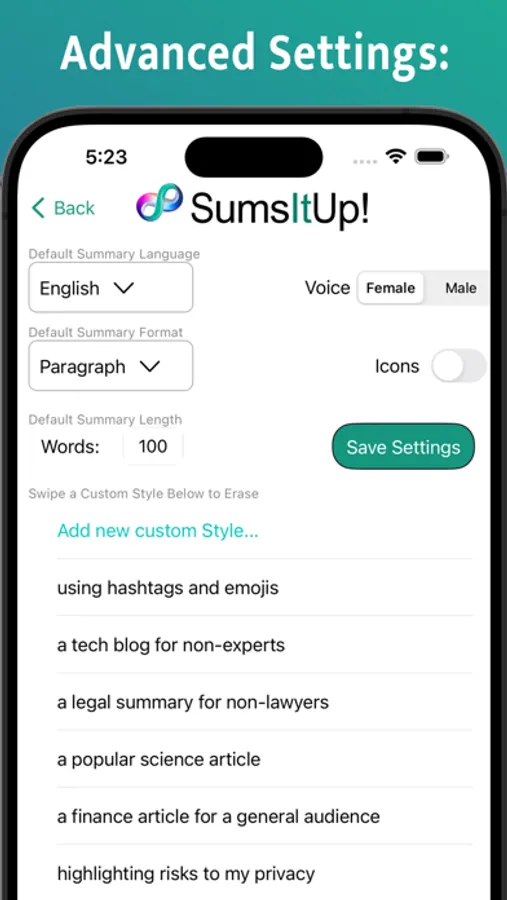 • Customization at Your Command: Set your default language, format, summary length, and even voice for summaries. Managing Custom Styles is straightforward – tailor your summaries to fit your unique needs.