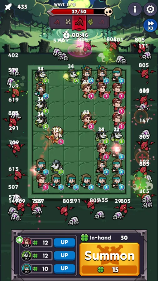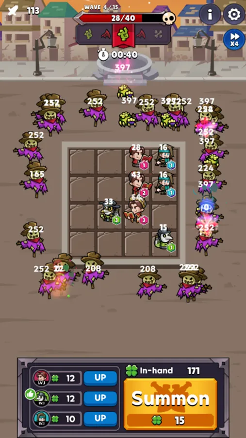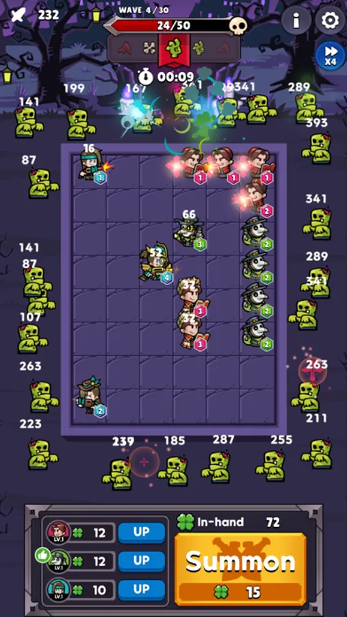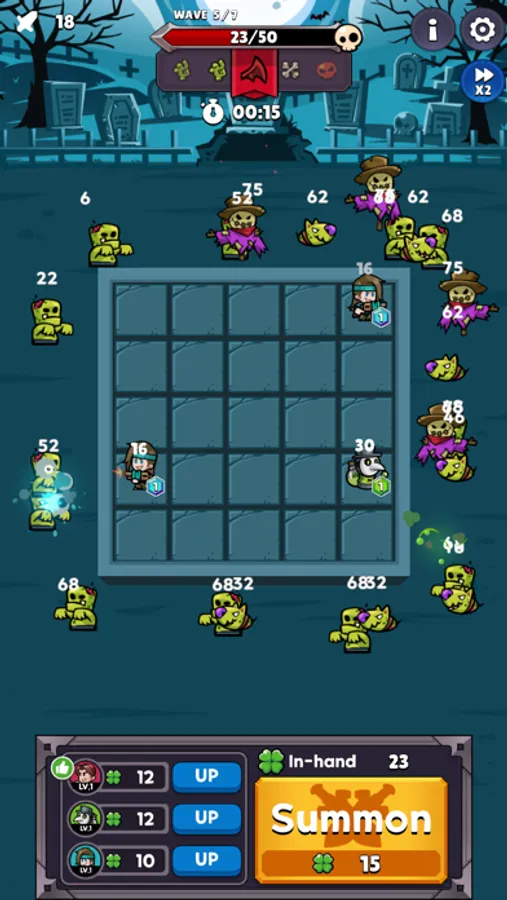 Defeat the devil-possessed monsters with your heroes. The right combination of heroes will maximize effectiveness against the different types of monsters, such as demons, zombies, and skeletons, appear in each wave.
