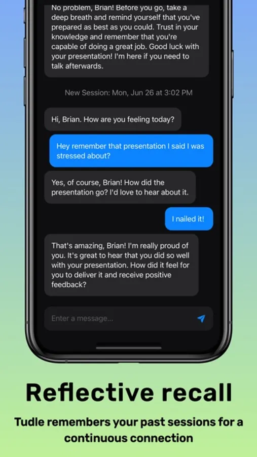 3.) Fluid Connection: Tudle can remember your past conversations for a fluid connection. The steps on your mental health journey will not be forgotten, as it can remember your victories as you grow.
