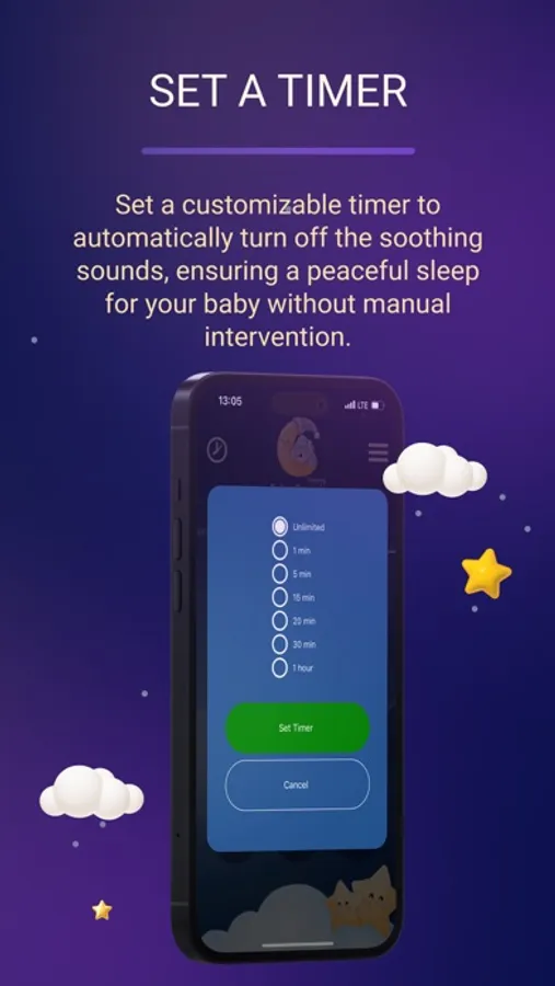 - Set a timer to automatically stop playing soothing sounds, helping your baby drift off to sleep effortlessly.