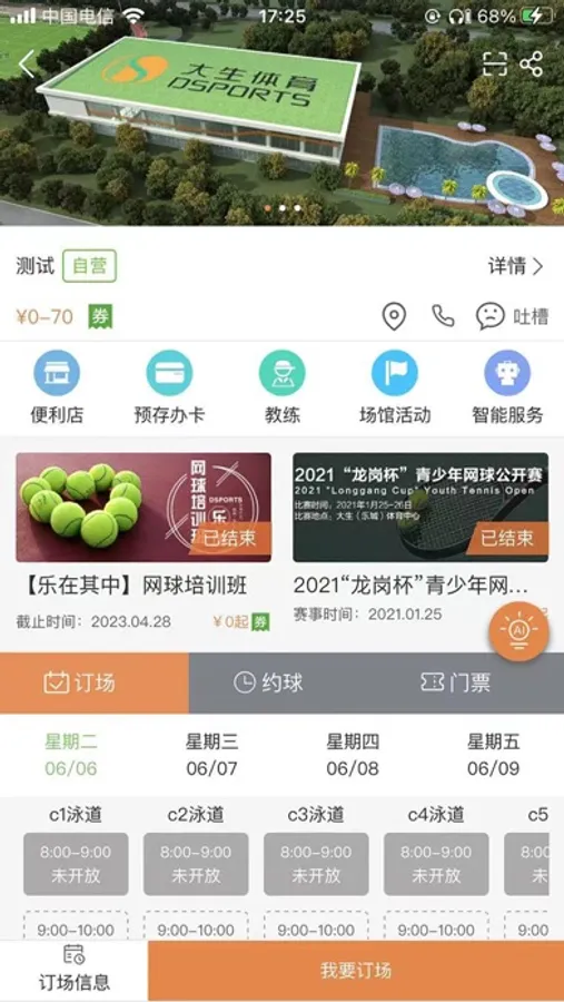 大生体育测试App集合了场地订场、约球、门票、个人中心、订单记录等功能,用于用户体育运动。 通过该app,用户能够查看场地预定情况,快速订场等。