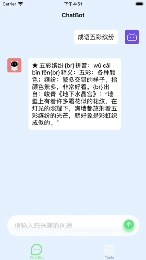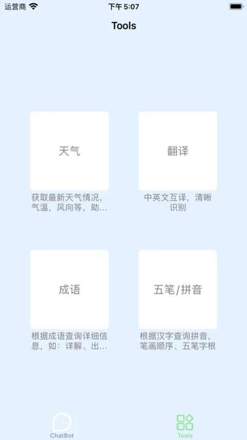 欢迎使用我们的APP!这个APP有多种实用的功能,包括天气查询、翻译、五笔查询、成语查询和智能聊天等。下面是每个功能的详细介绍: