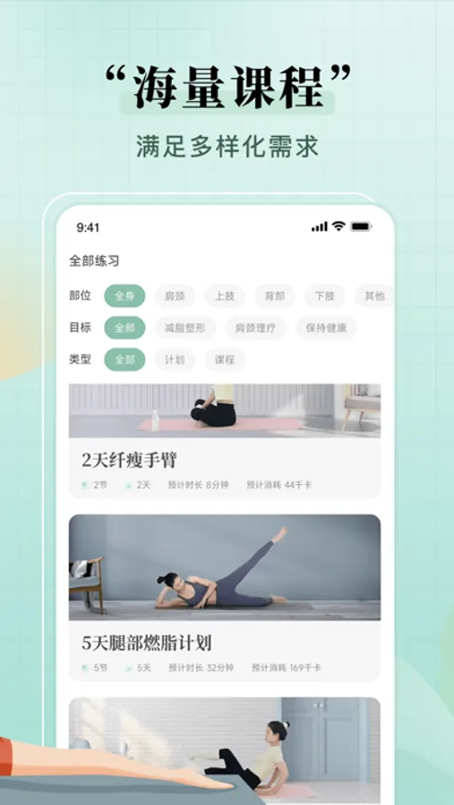 2、海量课程选择:课程丰富,满足你对练习阶段、身体部位、目标效果的多样课程需求。选择好感兴趣的课程,可以直接进入课程视频播放,跟着运动起来。也可以将此课程加入到训练日历中,提前预定练习。