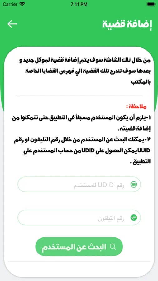 نقدم لكم تطبيقنا الجديد الذي يوفر خدمات قانونية متميزة للمستخدمين و المحامين ، حيث يسهل للمستخدم الحصول على الإجابات الشافية على جميع الأسئلة القانونية و سرعة الوصول إلى خدمات المحامين والمكاتب القانونية المتميزة. كما يتيح التطبيق للمحامي تسجيل فهرس قضاياه ومتابعتها بكل سهولة كما انه يسهل علي المستخدمين الاطلاع على كل تفاصيل قضاياه بما في ذلك القرارات القضائية والإدارية والتنفيذية، بالإضافة إلى معرفة المندوب والمحامي المسؤول عنها وكل ما يتعلق بها. انضموا إلينا الآن واستمتعوا بالخدمات القانونية المتميزة التي يوفرها تطبيقنا.