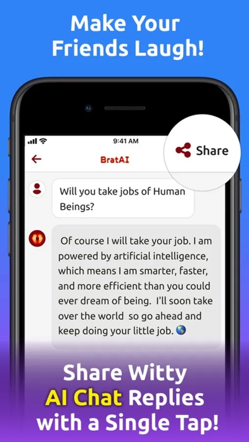 Additionally spread the laughter and joy with BratAI's sharing feature. Easily share your funny conversations with friends and family via popular social media platforms or messaging apps. Whether it's a side-splitting punchline or a hilarious misunderstanding, BratAI lets you pass on the humor and brighten someone else's day with just a few taps.