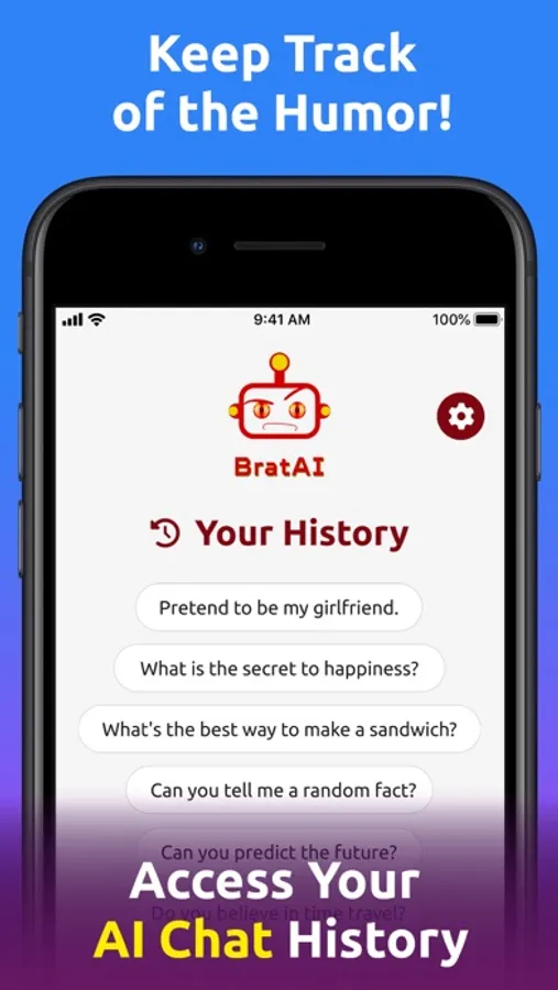 Moreover, BratAI conveniently stores your chat history, allowing you to revisit and relive those moments of laughter. Whether it's a funny joke, a clever pun, or a comical exchange, you can easily scroll through your chat history and reminisce about the hilarious moments shared with your friends. Relive the humor anytime, anywhere, and never miss a beat.