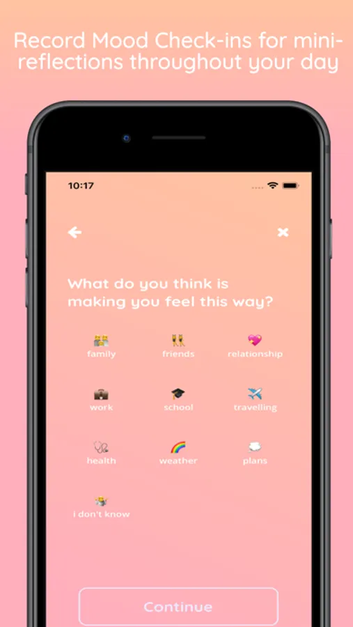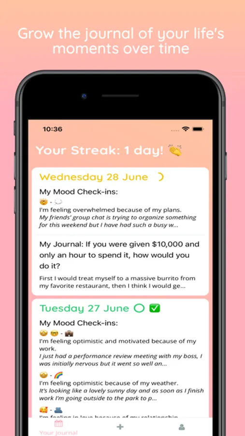 1. Mood Check-ins: Each day you receive a new motivational prompt to kick off a fresh journalling session