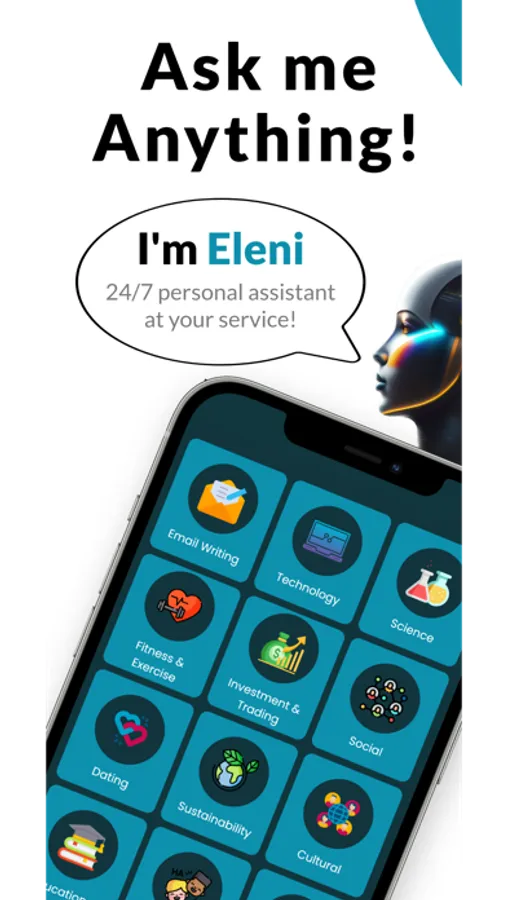 Enjoy the future of AI with Eleni. Transform your smartphone into a hub of knowledge, guidance, and companionship. Eleni is here to revolutionize the way you interact with technology. So download now and start exploring!