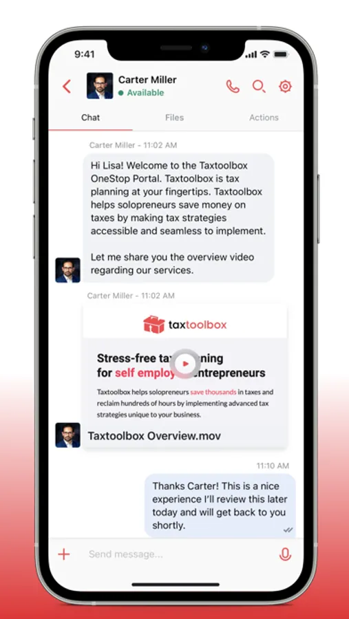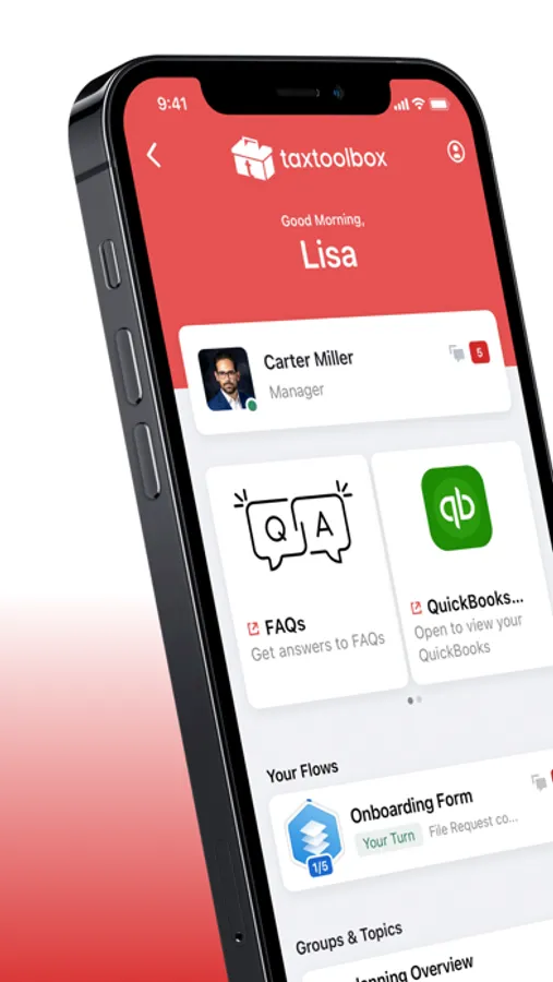 The Taxtoolbox App can be used to view & complete assigned tasks, chat with your Taxtoolbox team, view your documents, attend video meetings, and more. The app empowers you to stay organized and up-to-date on your tax planning — making it easier to access your private records and manage your taxes efficiently.