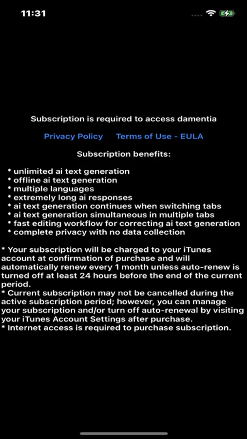* local device ai text generation that can generate ai text offline after purchasing autorenewable monthly subscription (which requires internet access to communicate with App Store)