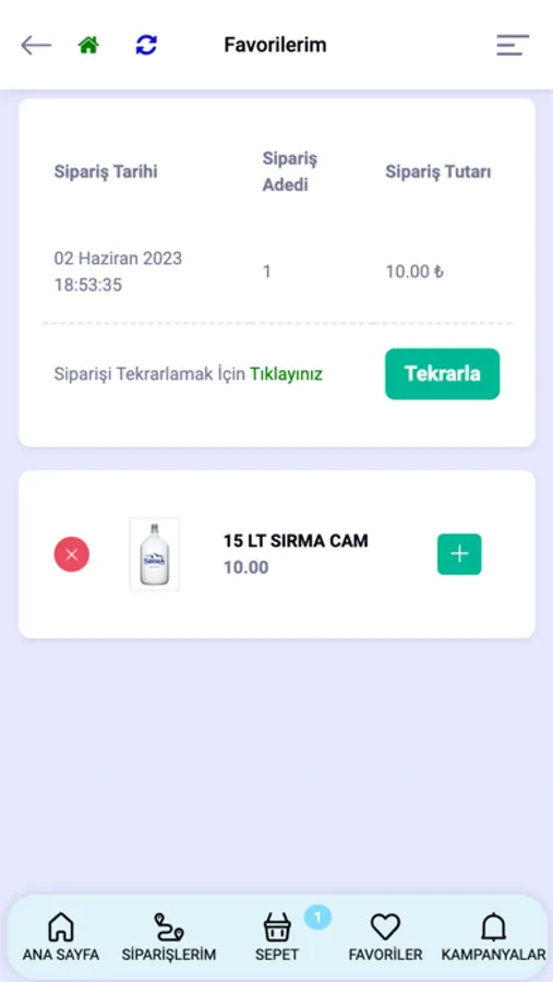 Bizim Su mobil uygulaması ile daha önceki siparişinizi tek tıkla tekrarlayabilirsiniz.
