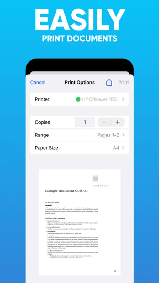 Print documents with ease: Send important files, contracts, presentations, or reports directly from your phone to the printer. Whether you're at the office or on the go, Printer Scanner for AirPrint App allows you to print your documents conveniently, without the need for a computer.