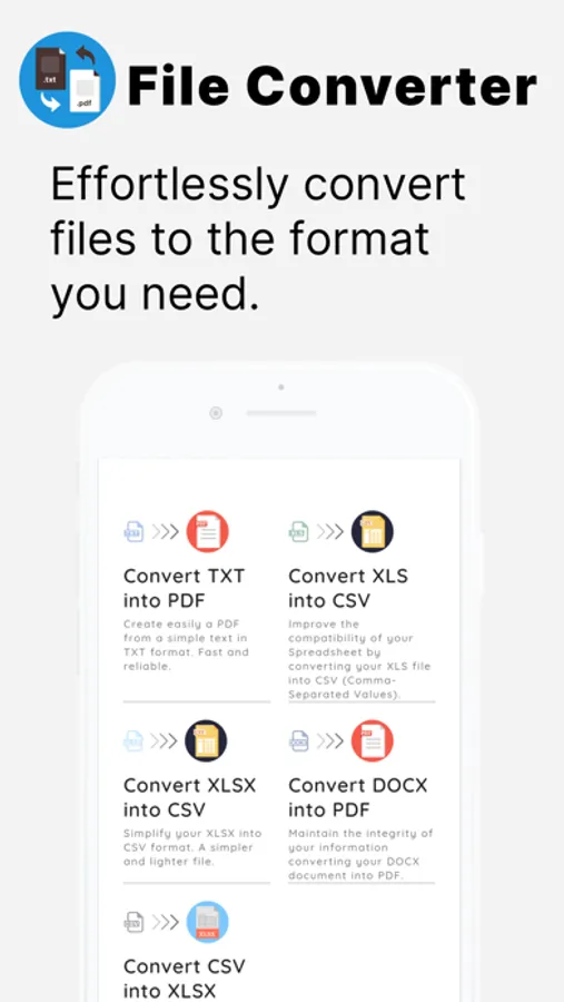 Easily convert files to different formats with File Converter App. This versatile app supports a wide range of file types, including text documents and SpreadSheets, and more. Convert effortlessly and quickly, preserving the quality of your files. Simplify your file conversion tasks with File Converter today!