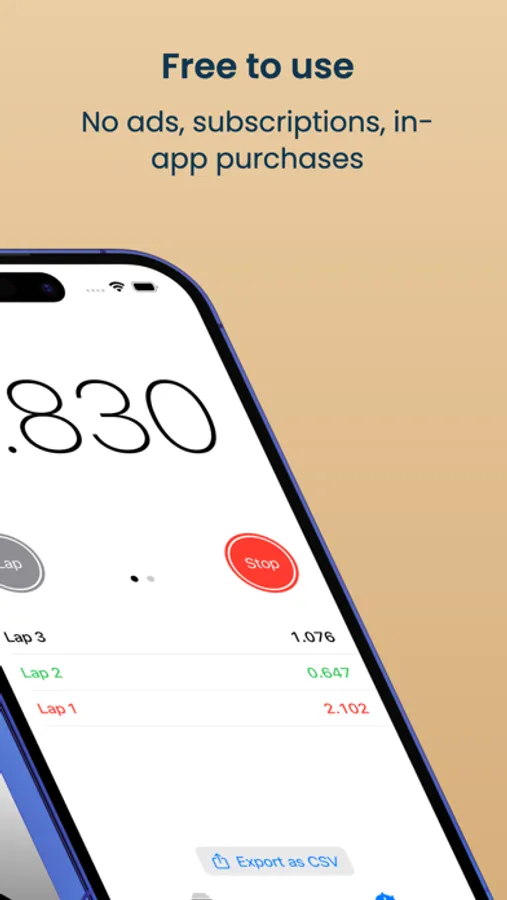 Stopwatch is free of ads, subscriptions, and in-app purchases. No hidden costs, no surprises—just a reliable stopwatch app at your fingertips. Stopwatch respects your privacy and never collects any personal data.