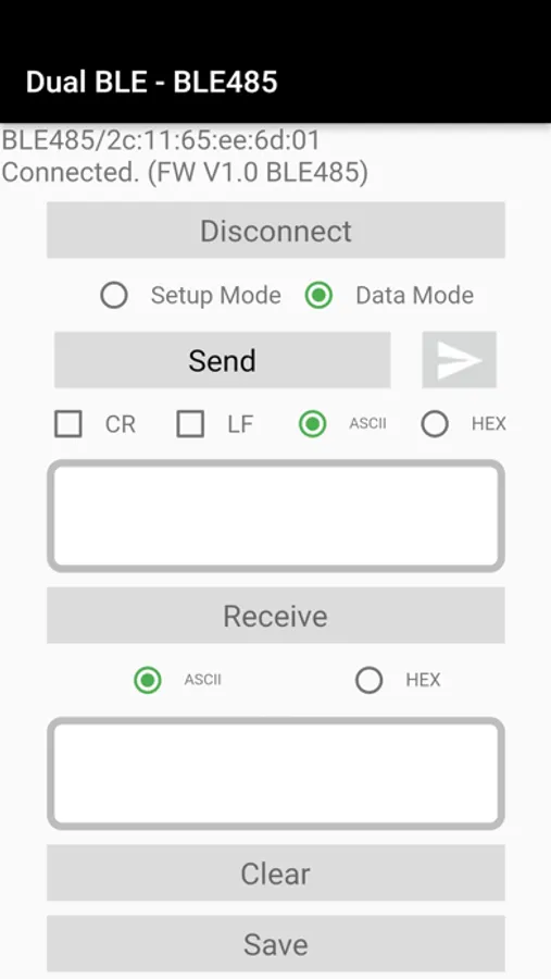 The iOS portable devices will connect with the Bluetooth Low Energy (BLE) to serial port converter devices and exchange data with them bi-directional. The serial port includes RS-232 or RS-422 RS-485 interfaces. The user will test the APP with the SCADA, Robot, UAV, PLC, CNC or etc. with the BLE to serial port devices. The APP will be customized to meet the specific applications.