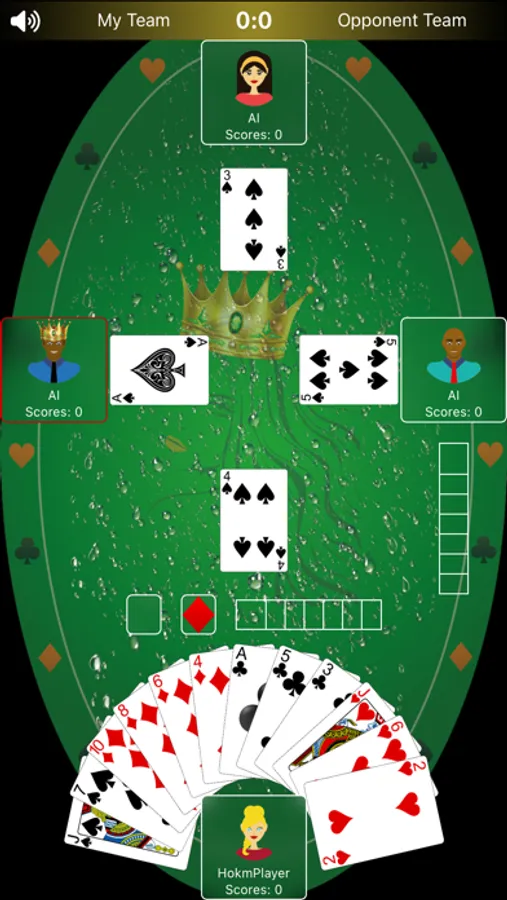 At the beginning of the game, the King/Queen is randomly chosen (identified by his/her crown). He/she receives the first five cards and determines the trump suit (Hokm) for the big round.
