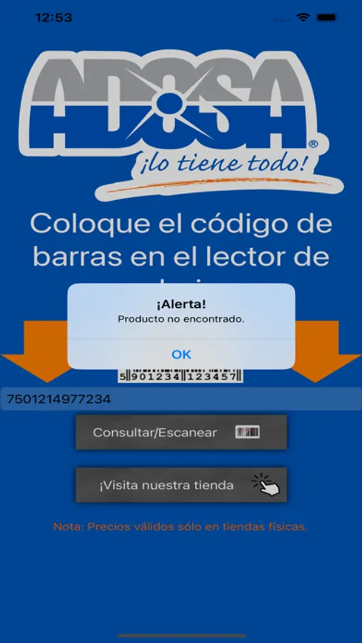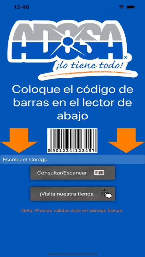 Aplicación para verificar los precios de los productos en las tiendas físicas de Adosa mediante escaneo de código de barras.
