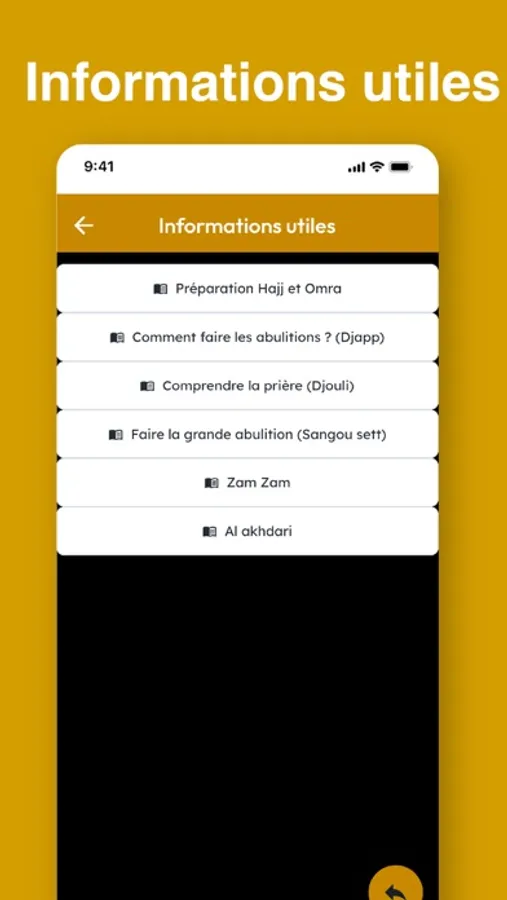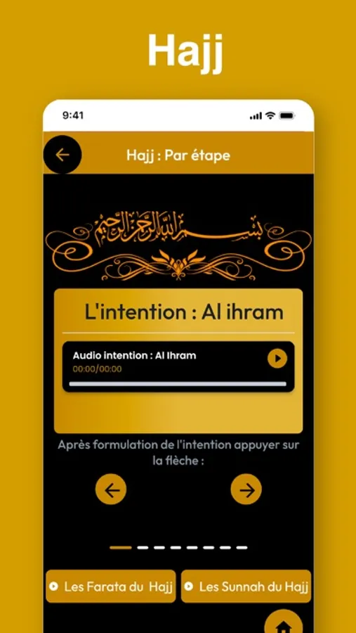 Notre application mobile est dotée de fonctionnalités qui facilitent votre parcours et vous aide à comprendre les prières et les rituels qui sont obligatoires et recommandés.