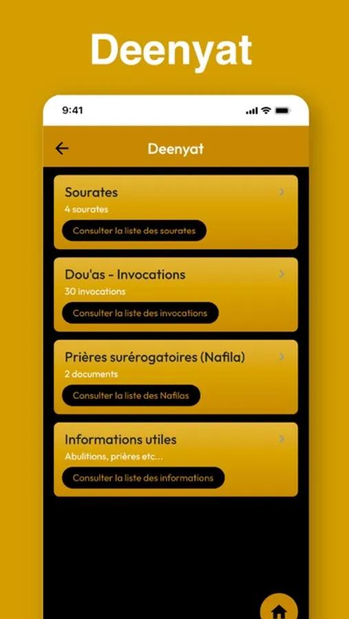 L’onglet Deenyat fournit des rappels importants sur des prières (obligatoires et surérogatoires), les douas, et la lecture du Coran.
