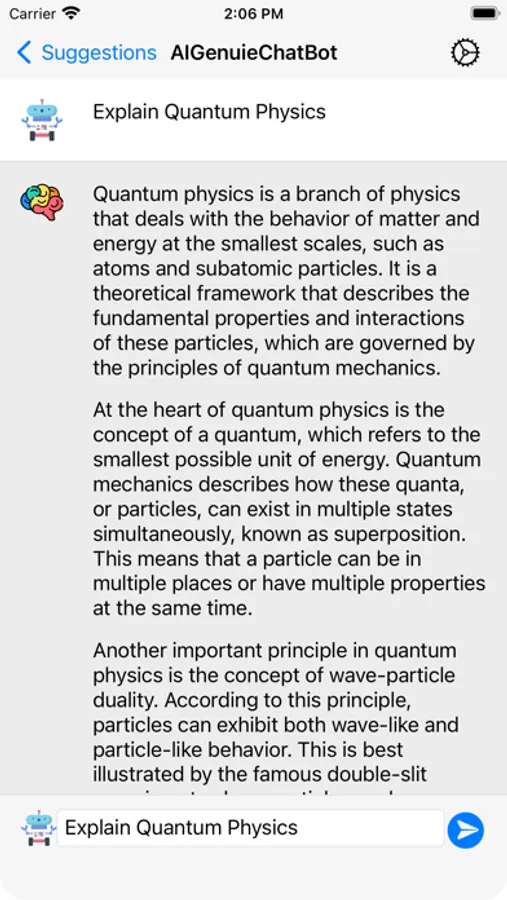 AIGenuieChatBot is chat messenger where you can ask questions and provide with good answers. AIGenuieChatBot can provide you any physics,mathmatics,translation stuff with in micro seconds.