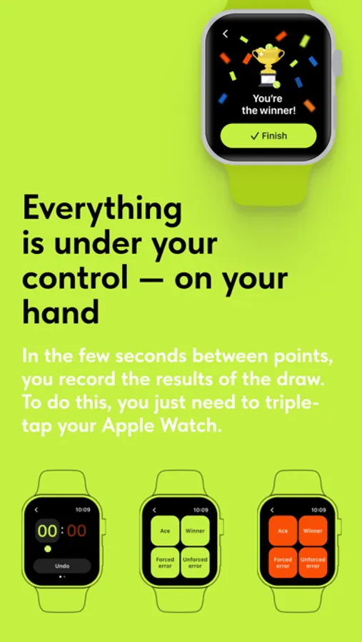 First Serve is designed for seamless match tracking using your Apple Watch. In the brief moments between rallies, a simple triple-tap on your watch allows you to log the outcome of each point. It’s fast, non-intrusive, and fits naturally into your rhythm of play. The app is built to keep you focused on the court while capturing the essential data that helps you grow as a player.