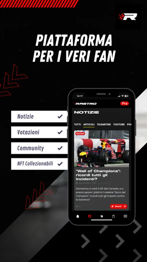 E per concludere, nella sezione COMMUNITY potrai personalizzare la tua esperienza, consultando contenuti fatti dai tifosi su qualsiasi argomento a tema Motorsport. Dai motori a due tempi, ai veri Tifosi Ferrari, curiosità, pronostici e statistiche, scegli ciò che ti appassiona e rimani sempre aggiornato sulle tue passioni!