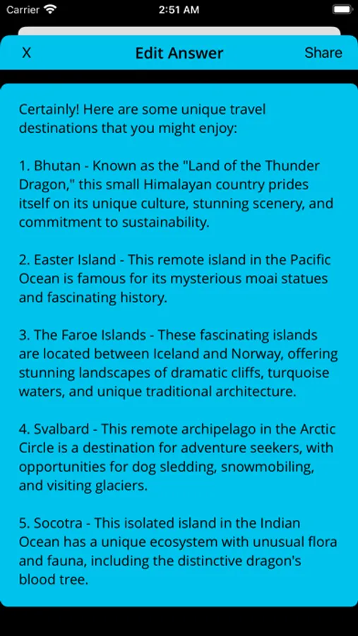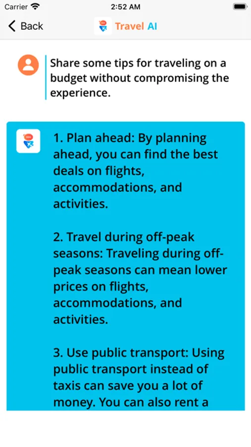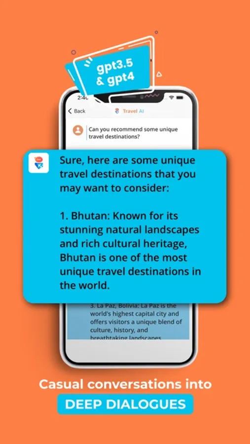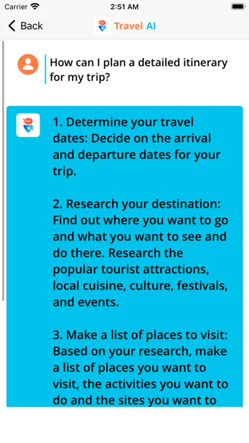 Welcome to Travel AI, your ultimate travel companion designed to enhance your journey and create unforgettable experiences. Whether you're planning a weekend getaway or a global adventure, Travel AI has got you covered. Powered by the advanced GPT3.5 language model, this app provides personalized recommendations, insightful travel tips, and real-time assistance to make your trip seamless and enjoyable.
