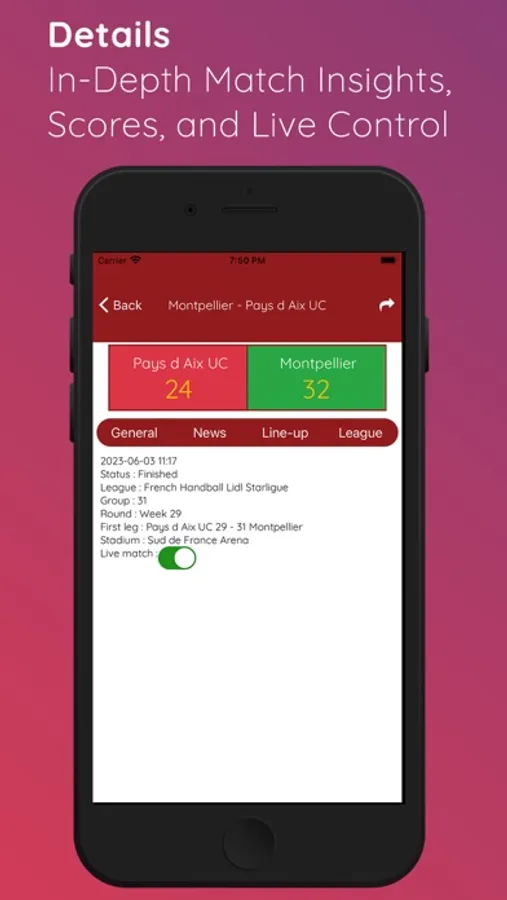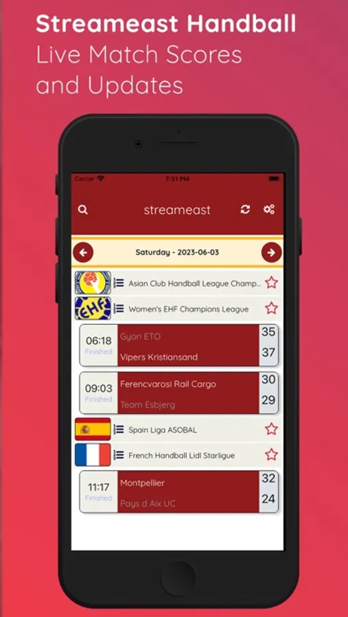 - Live Scores: Get real-time updates of Handball matches, including live scores, match details, and game progress.