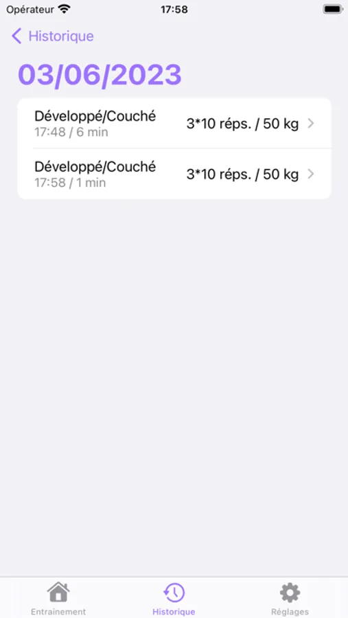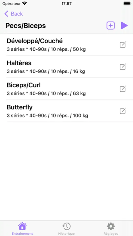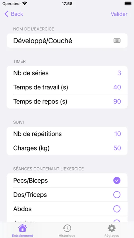 Lancez l’exercice ou la séance, retrouvez votre nombre de répétitions et dernière charge, et laissez-vous guider par le Tabata/Timer.