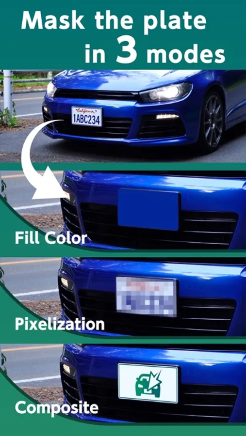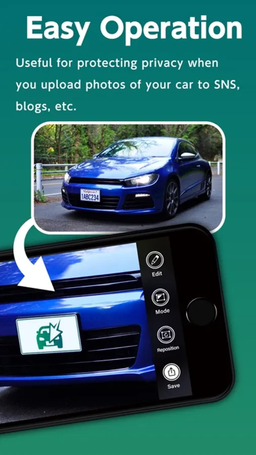 With this app you can easily mask only the plate, so it helps to protect privacy,when you upload photos of your car to SNS and blogs,etc.