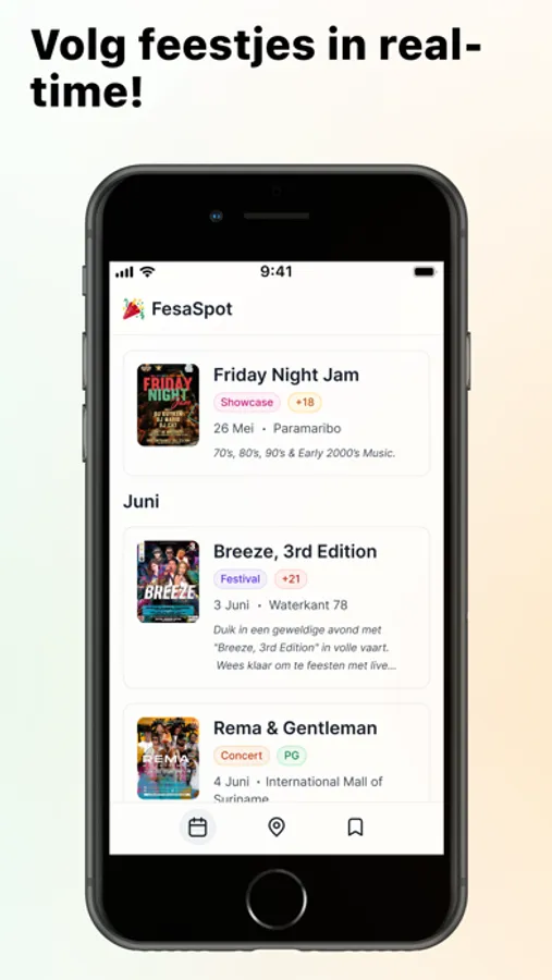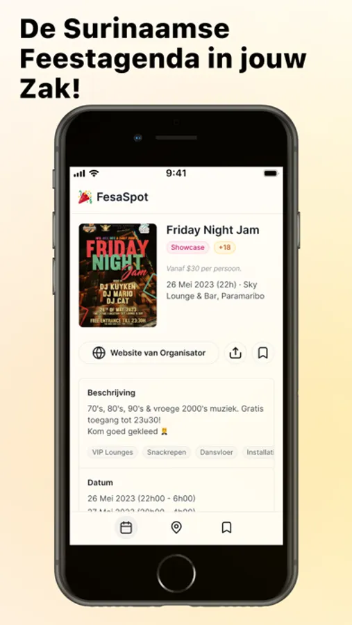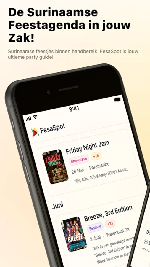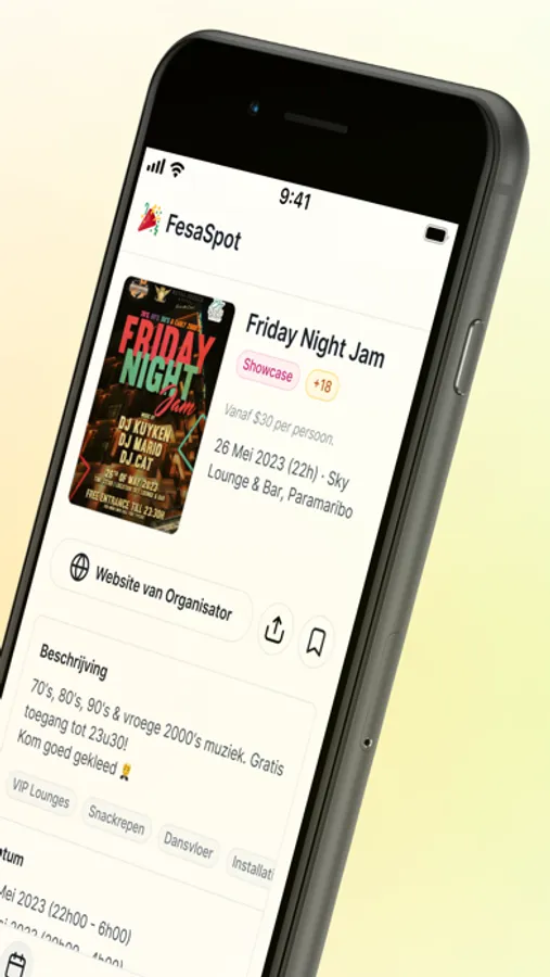 Ontdek een wereld vol feestelijk plezier met FesaSpot! Deze ultieme party app is speciaal ontworpen voor Suriname en stelt jou in staat om moeiteloos alle opkomende feestjes te ontdekken. Met een uitgebreide kalender, gedetailleerde informatie over artiesten en locaties, en live updates, zul je nooit meer een geweldig feest missen.