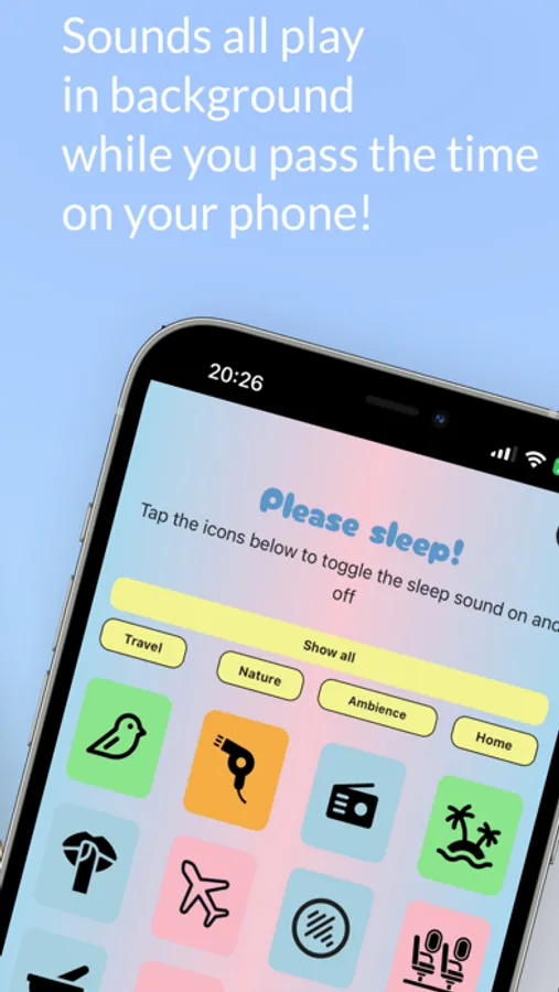 This app features a diverse selection of 20 carefully curated sounds from four distinct categories: Nature, Travelling, White Noise Ambience, and Home. These categories encompass a variety of soothing noises, from the calming rhythm of ocean waves to the hum of a hair dryer, and even include the ambient white noise..