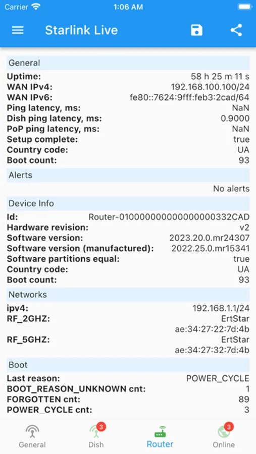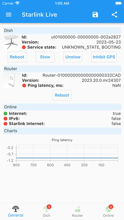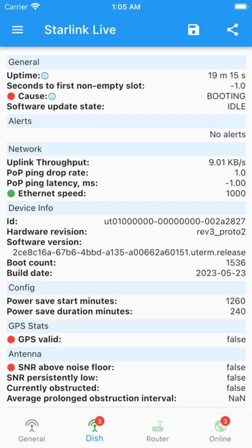 - View telemetry available in DebugData, but updated from Starlink online: statuses, alerts, basic stats, current configurations, etc.